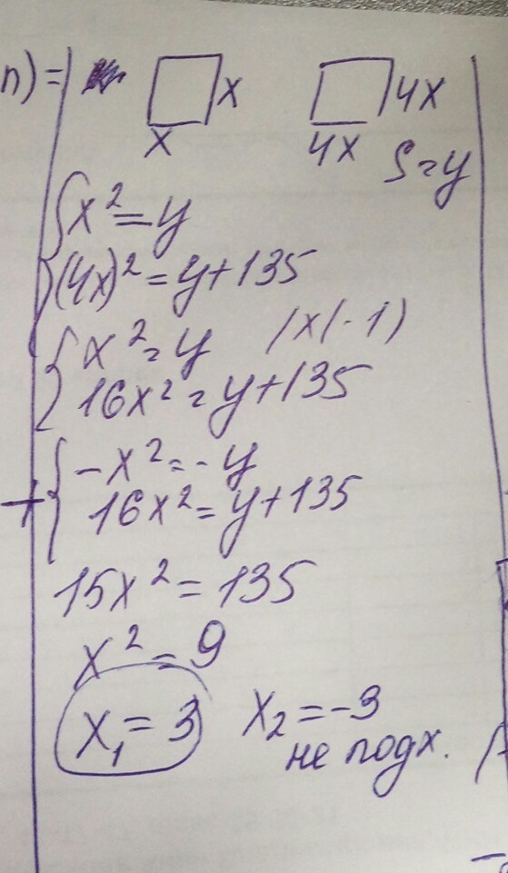 сторону квадрата увеличели в 4 раза и получили новый квадрат, площадь которого на 135см больше, найдите сторону данного квадрата.