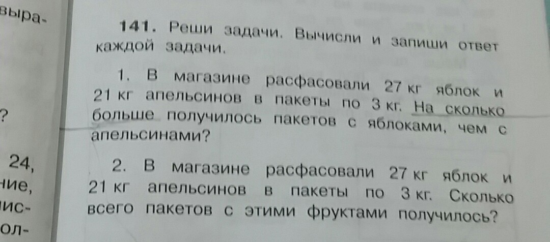 2) 21:3=7 пакетов с апельсинами