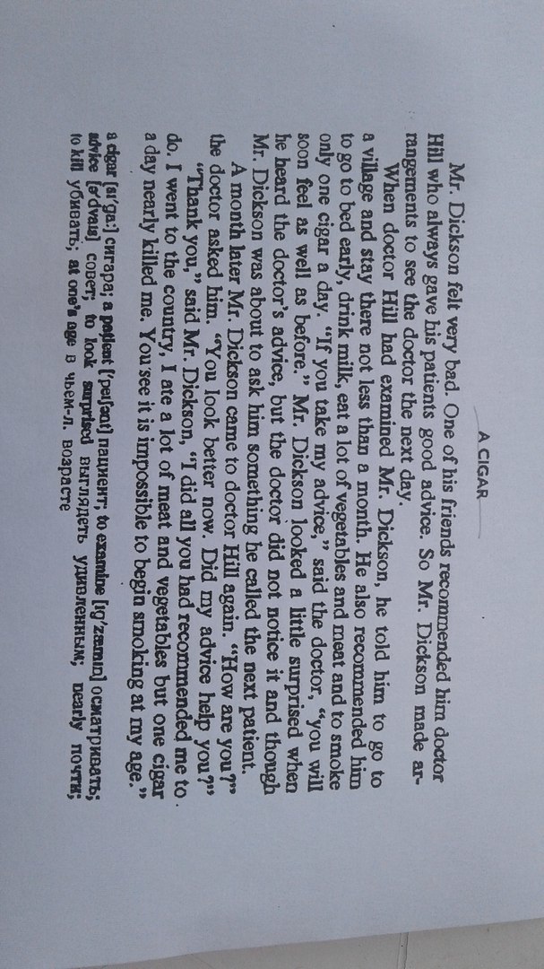 Mr.Dickson thanked and added that he had done all the doctor had recommended him to do.He said that he had gone to the country,had eaten a lot of meat and vegetables but one cigar a day had nearly killed him.He explained that it was impossible to begin smoking at his age.