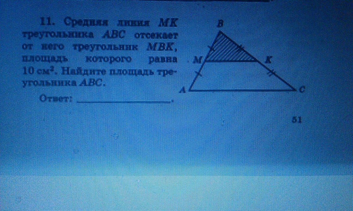 средняя линия делит сторону пополам. Значит наши треугольники подобны с коэффициентом подобия 1/2. Отношение площадей равно коэф. подобия в квадрате, т.е. 1/4. Площадь тр-ка АВС=4*10=40см