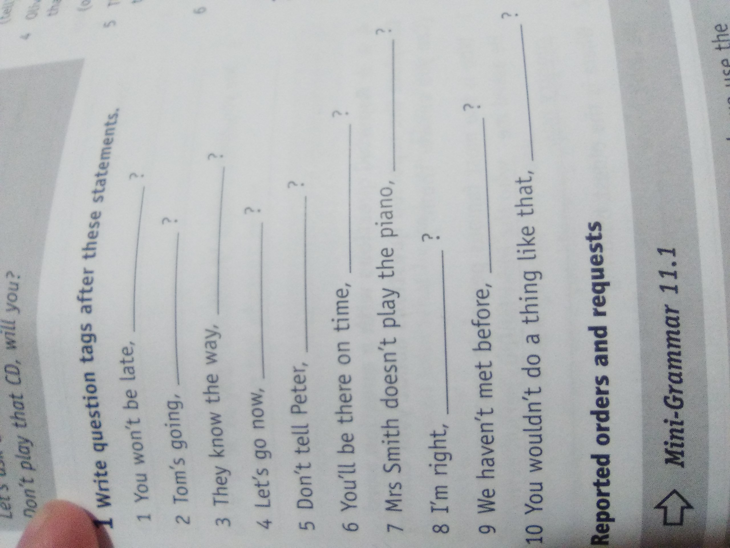 1 will you 2 isn't he 3 do they 4 shall we 5 does he 6 will you 7 does he 8 aren't i 9 have we 10 would you