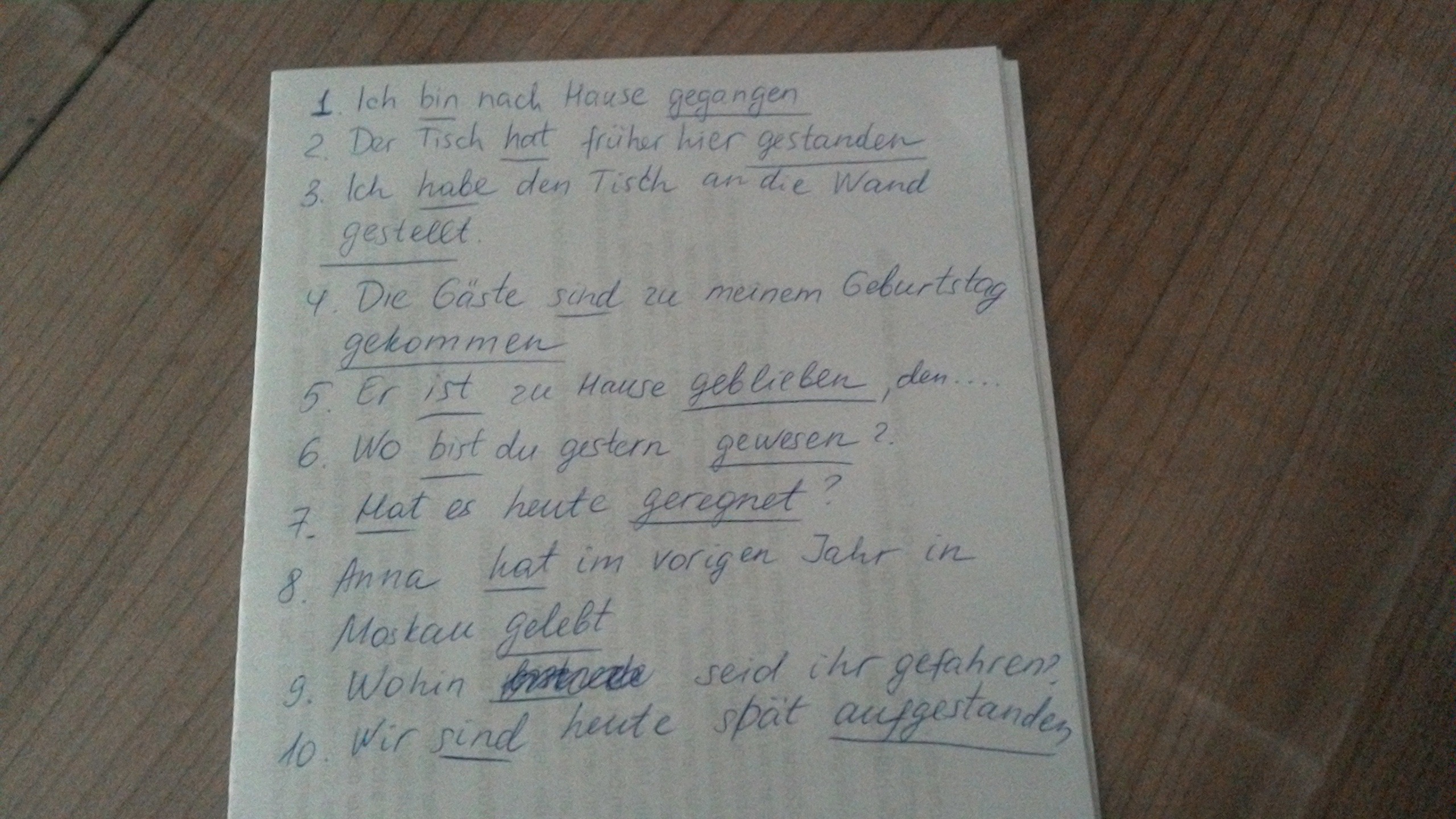 Выберите вспомогательный глагол sein или haben, не забудьте поставить его в нужную форму, подчеркните сказуемое в Perfekt: 1. Ich _____ nach Hause gegangen. 2. Der Tisch _____ früher hier gestanden. 3. Ich ______ den Tisch an die Wand gestalt. 4. Die Gräste ______ zu meinem Geburtstag gekommen. 5. Er ____ zu Hause geblieben, den nervous ist krank. 6. Wo ____ du gestern gewesen? 7. ______ es heute geregnet? 8. Anna _______ im vorigen Jahr in Moskau gelebt. 9. Wohin ______ ihr gefahren? 10. Wir ______ heute spät aufgestanden.