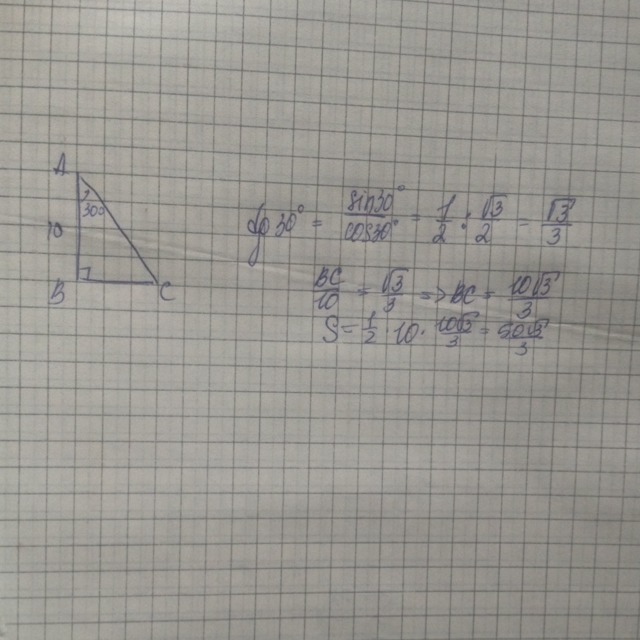 В прямоугольном треугольнике один из катетов равен 10, а острый угол прилежащий к нему ,равен 30. Найдите площадь треугольника