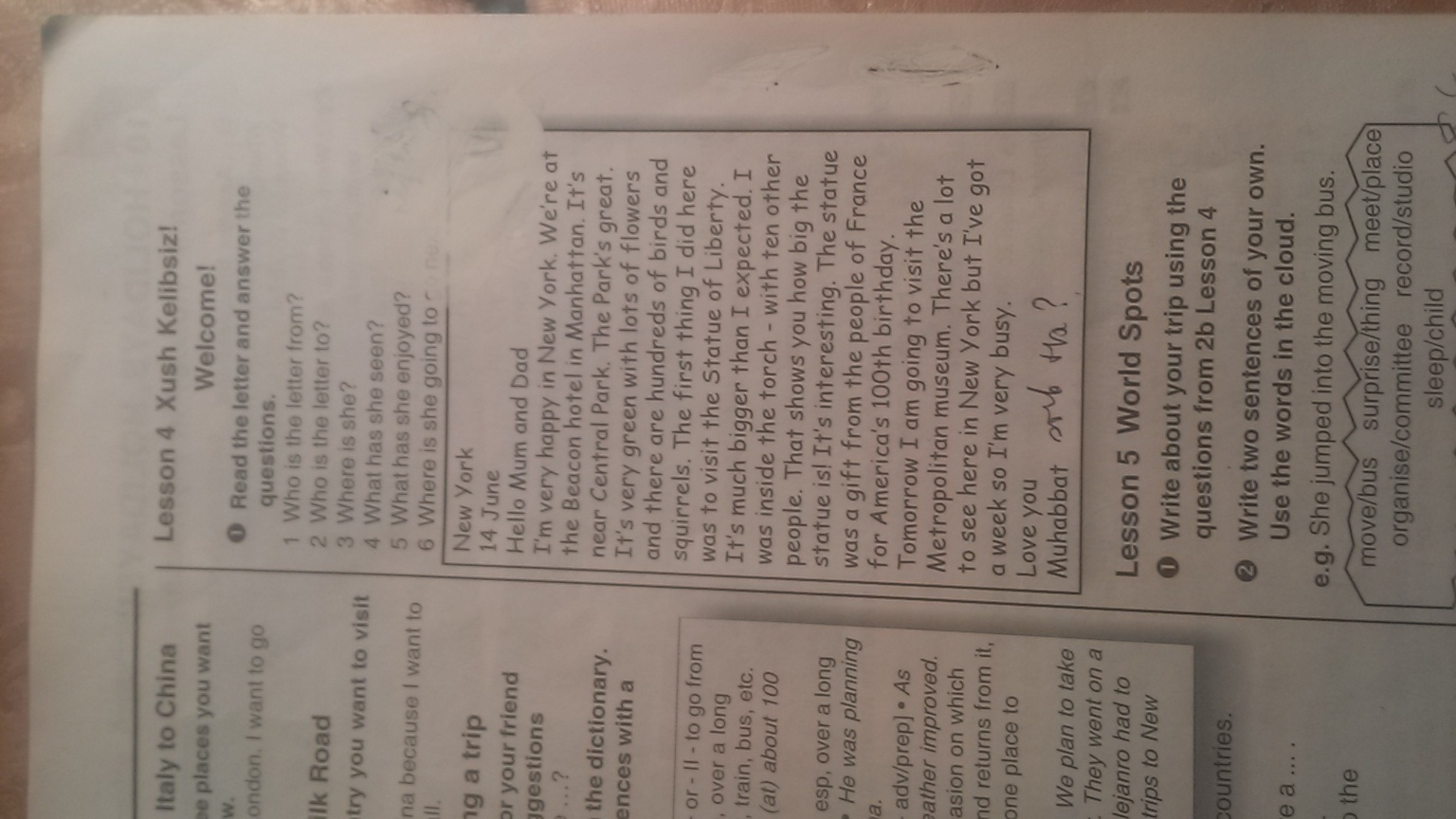 Привет мам и пап. Я очень счастлив в Нью Йорке. Мы находимся в Бэкон-отеле на Манхэтонне. Это не далеко от Центрального парка. Парк большой. Он зелёный со множеством цветов, и более 100-ни птиц и много белок. Первое дело что я сделал здесь, было посищение Статуи Свободы. Это было больше, чем я думал. Я был внутри фонаря с другими 10 людьми. Я бы показал вам, какого же это все огромное. Это интересно. Статуя была подарена Францией, Америке в честь 100-летия. Завтра я хочу посетить музей метрополитена. Здесь много чего есть на что есть посмотреть в Нью Йорке. Но на этой недели я слишком занят. С любовью Маххабат.