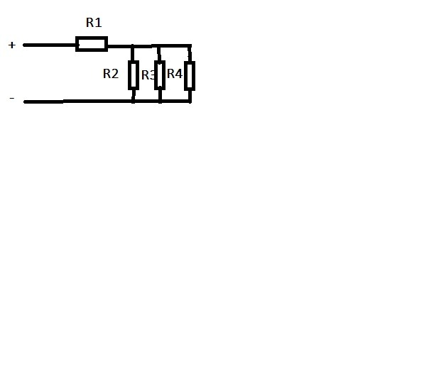 четыре резистора сопротивлением r1 4 ом, r2=r3=r4=9 ом, определите общее сопротивление участка цепи, напряжение на всем участке и на каждом резисторе, если через первый резистор проходит ток силой I=3А