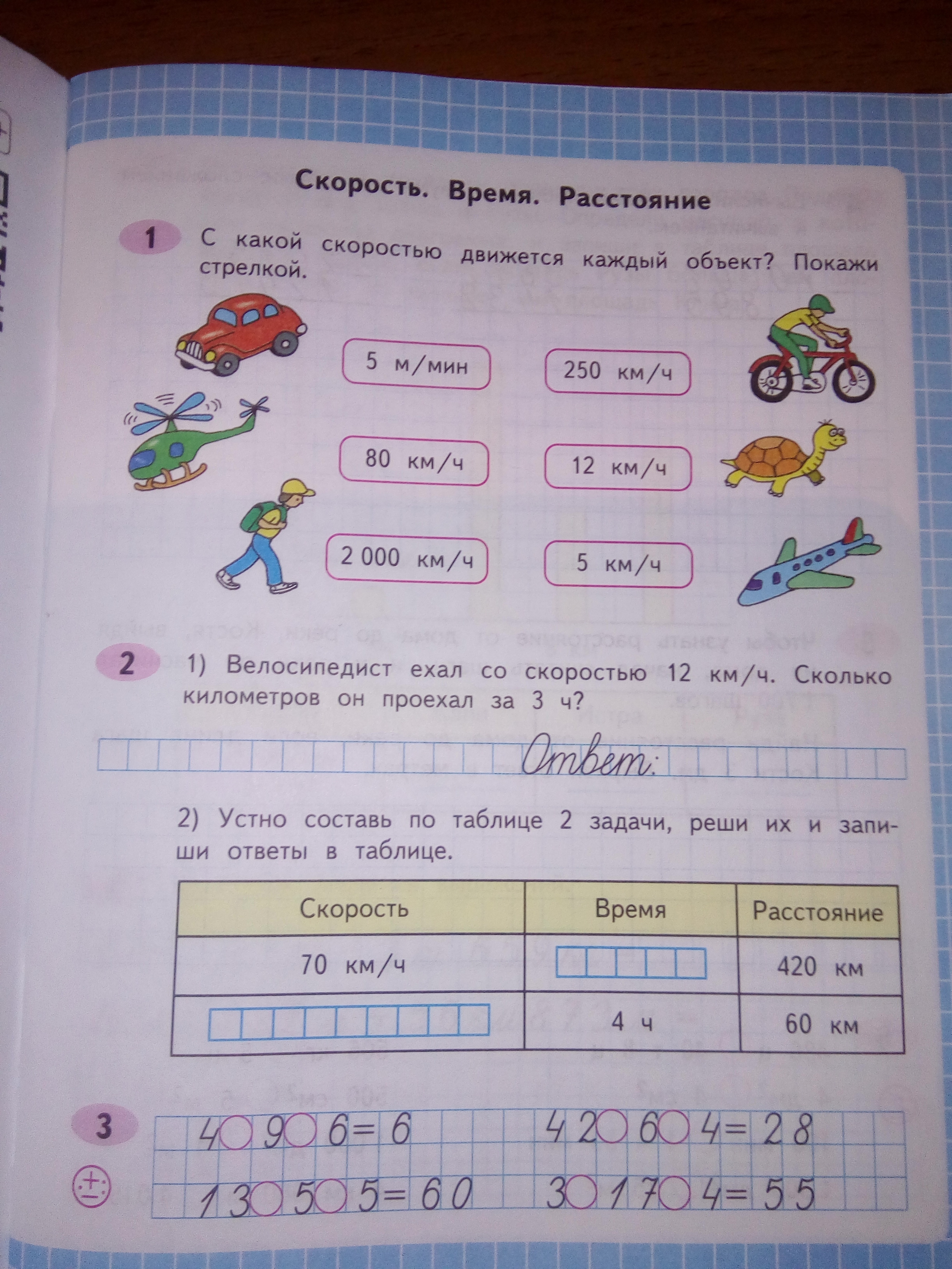 1. Самолет 2 000 км/ч , Вертолёт 250 км/ч, Машина 80 км/ч , Велосипедист 12км/ч, Пешеход 5 км/ч, Черепаха 5м/ч.