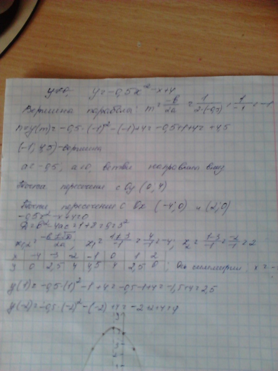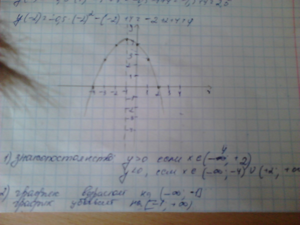 постройте график функции у=-0,5x^2-х+4. По графику определите промежутки знакопостоянства и промежутки возрастания и убывания функции.