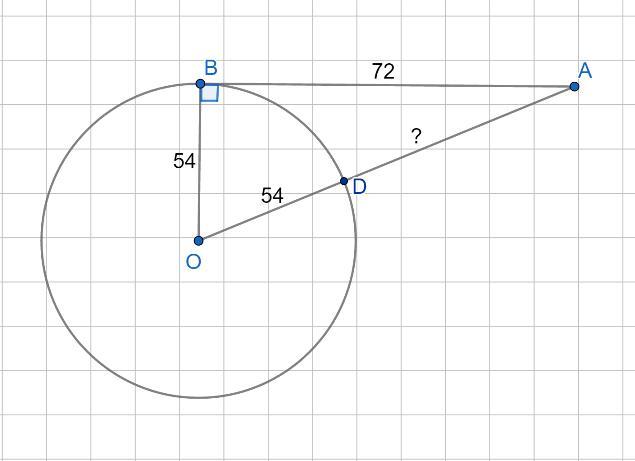 Отрезок АВ= 72 касается окружности радиуса 54 с центром О в точке В.Окружность пересекает отрезок АО в точке В.Найдите АД