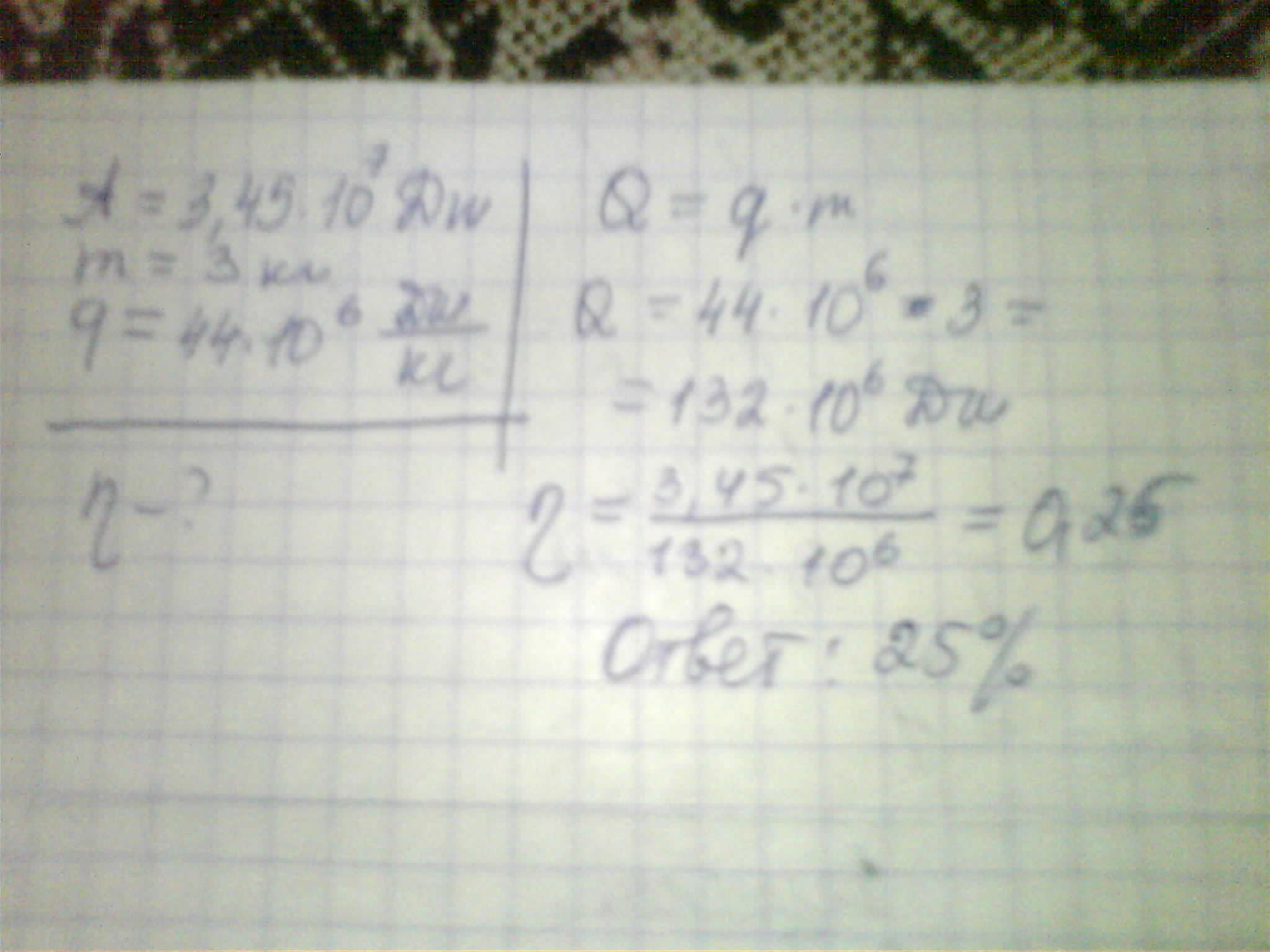 Двигатель внутреннего сгорания совершил полезную работу, равную 3,45*10в7степенДж и при этом израсходовал бензин массой 3кг. Определите КПД этого двигателя. Ответ:25%(важно само решение)