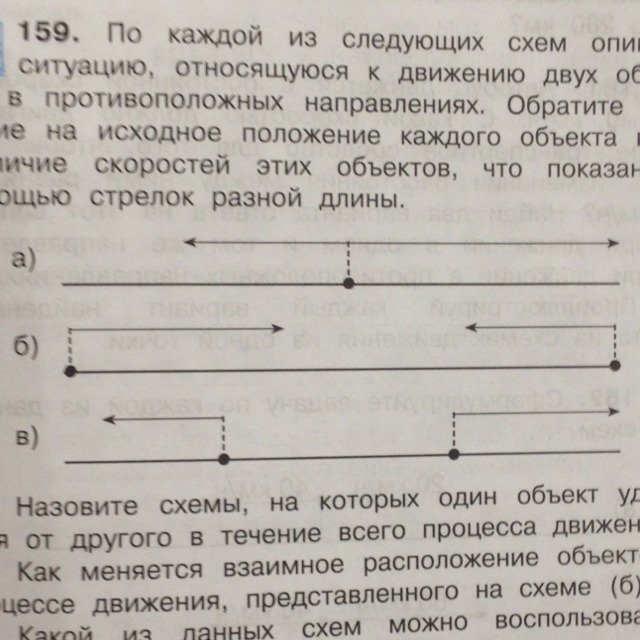 159. По каждой из следующих схем опишите ситуацию, относящуюся к движению двух объектов в противоположных направлениях. Обратите внимание на исходное положение каждого объекта и различие скоростей этих объектов, что показано с помощью стрелок разной длины.