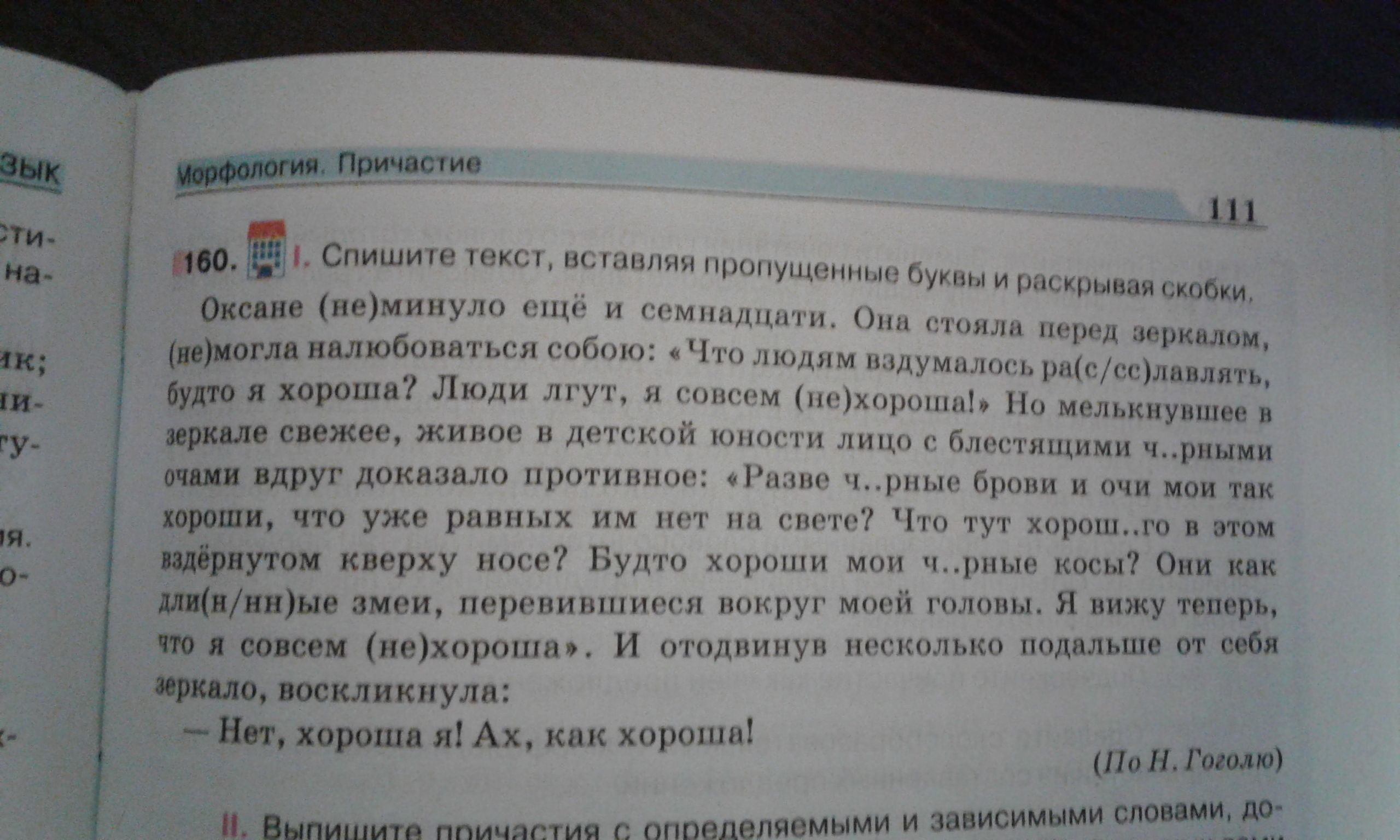 Оксане не минуло ещё и семнадцати.Она стояла перед зеркалом,не могла налюбоваться собою:<<Что людям вздумалось расславлять,будто я хороша?Люди лгут,я совсем не хороша!>>Но мелькнувшее в зеркале свежее,живое в детской юности лицо с блестящими чёрными очами вдруг доказало противное:<<Разве чёрные брови и очи мои так хороши,что уже равных им нет на свете?Что тут хорошего в этом вздёрнутом кверху носе? Будто хороши мои черные косы?Они как длинные змеи,перевившиеся вокруг моей головы.Я вижу теперь ,что я совсем не хороша>>.И отодвинув несколько подальше от себя зеркало ,воскликнуло