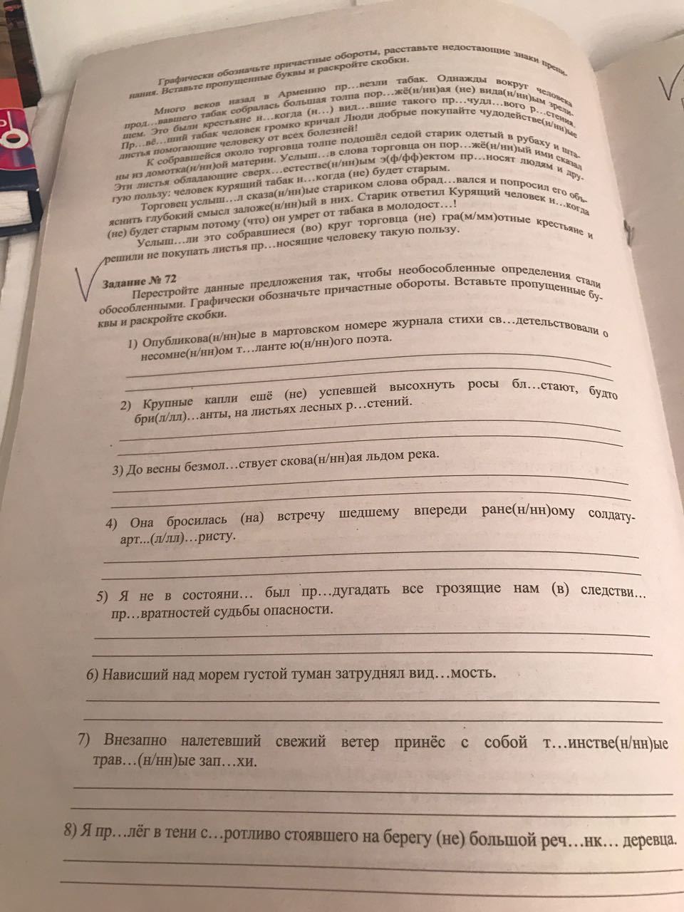 1.Стихи, опубликованные в мартовском номере журнала, свидетельствовали о несомненном таланте юного поэта2. Крупные капли росы, еще не успевшей высохнуть, блистают, будто бриллианты, на листьях лесных растений. 3.До весны безмолвствует река, скованная льдом. 4.Она бросилась на встречу раненому солдату-артиллеристу, шедшему впереди. 5.Я не в состоянии был предугадать все опастности, грозящие нам в следствии превратностей судьбы. 6.Густой туман, нависший над морем, затруднял видимость. 7.Свежий ветер, внезапно налетевший, принес с собой таинственные травяные запахи. 8.увы не вижу