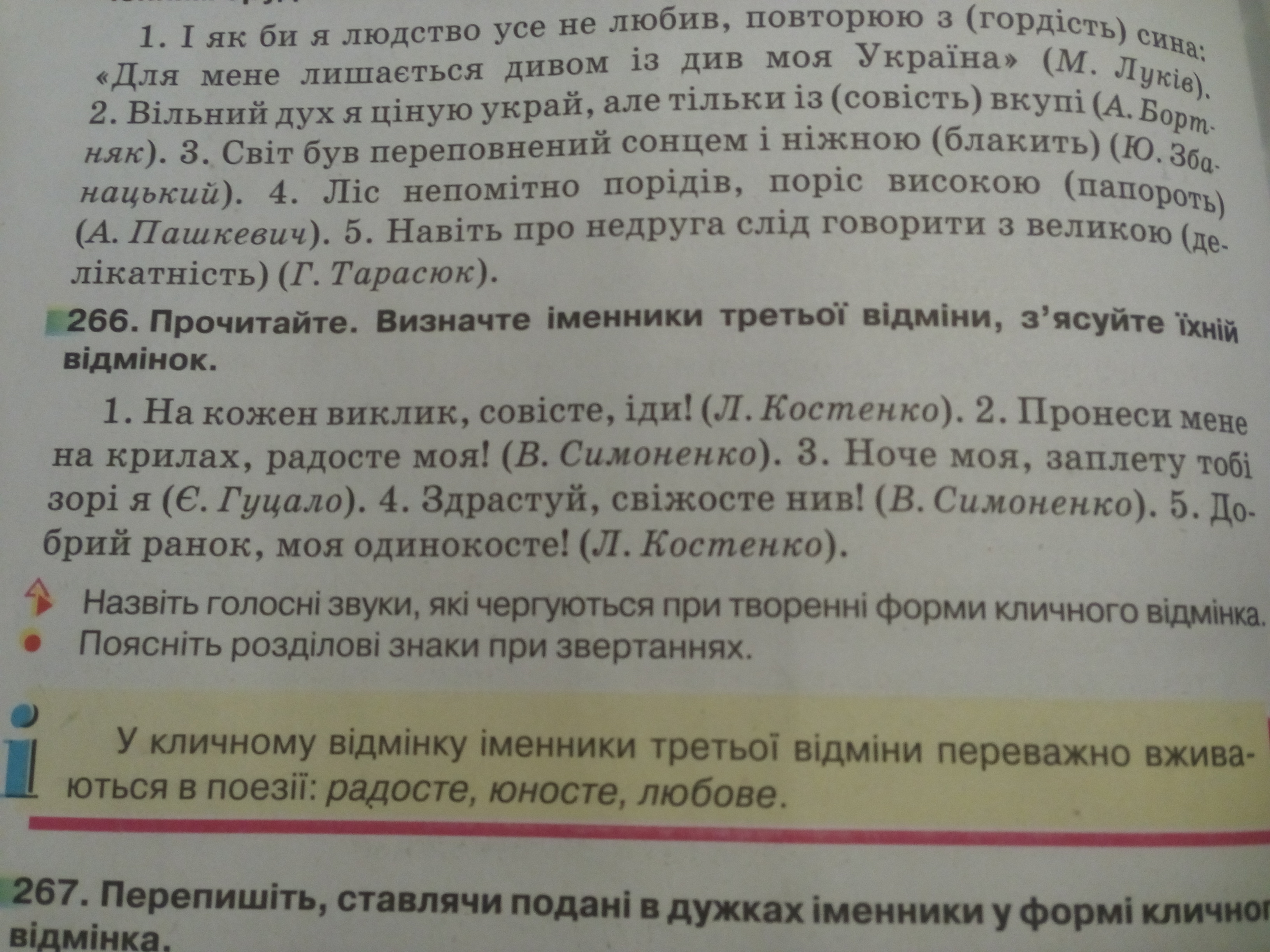 1. Совісте(кличний відмінок), 2. Радосте(кличний відмінок), 3. Ноче(кличний відмінок), 4. Свіжосте(кличний відмінок),5. Одинокосте(кличний відмінок)