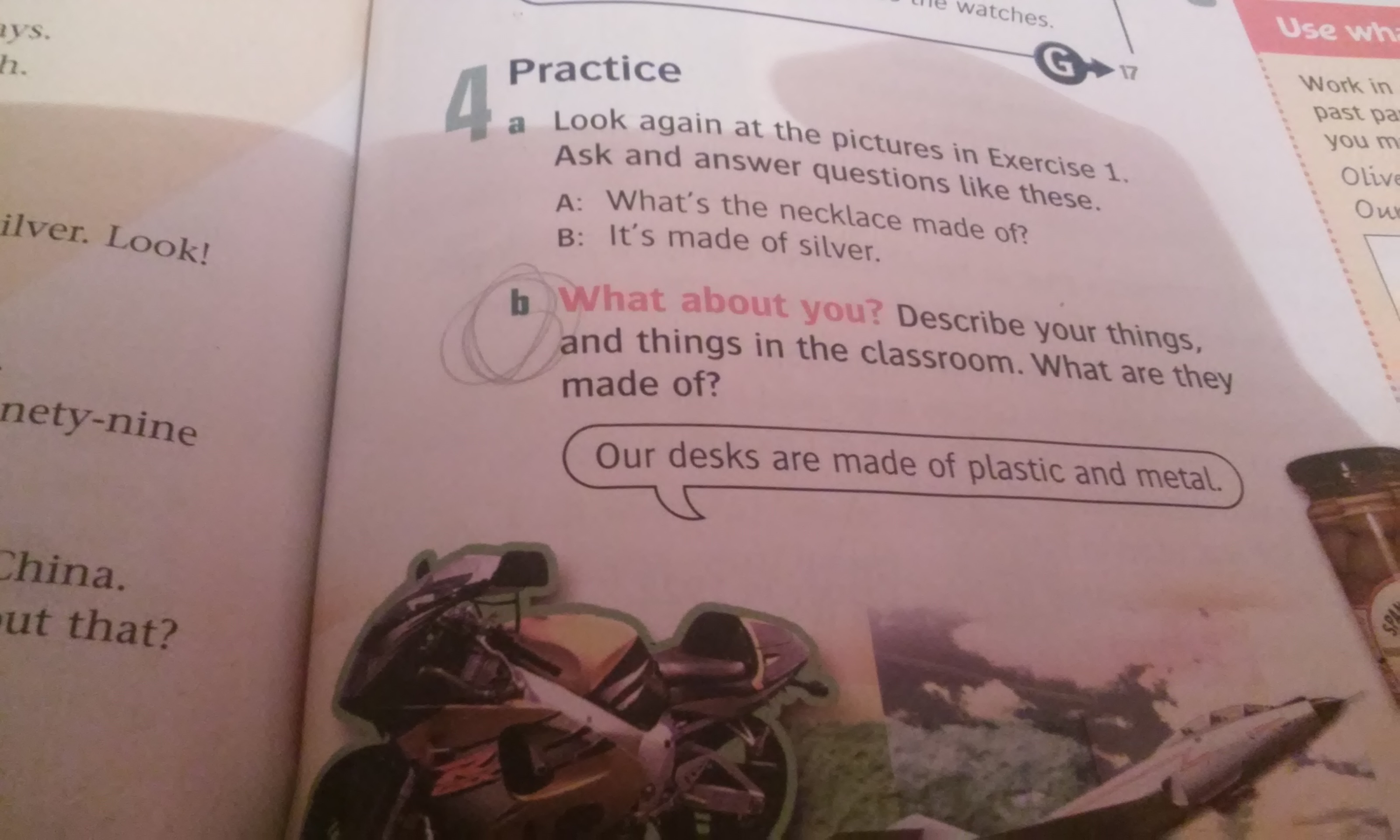 Our chairs are made of wood and metal. Our doors are made of wood. Our windows are made of glass. Our pencil cases are made of tissue. Our floor is made of linoleum.