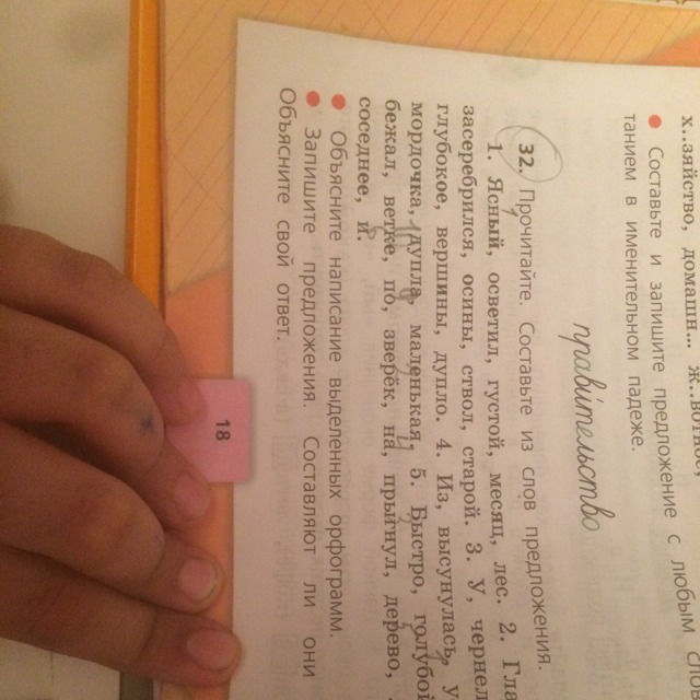 1.Ясный, осветил, густой, месяц, лес.2. Гладкий, засеребрился, осины, ствол, старой.3. У, чернело, её, глубокое, вершины, дупло.4. Из,высунулась,усатая, мордочка, дупла, маленькая.5.Быстро, голубой, побежал, ветке, по,зверёк, на,прыгнул, дерево, легко, соседнее, и.