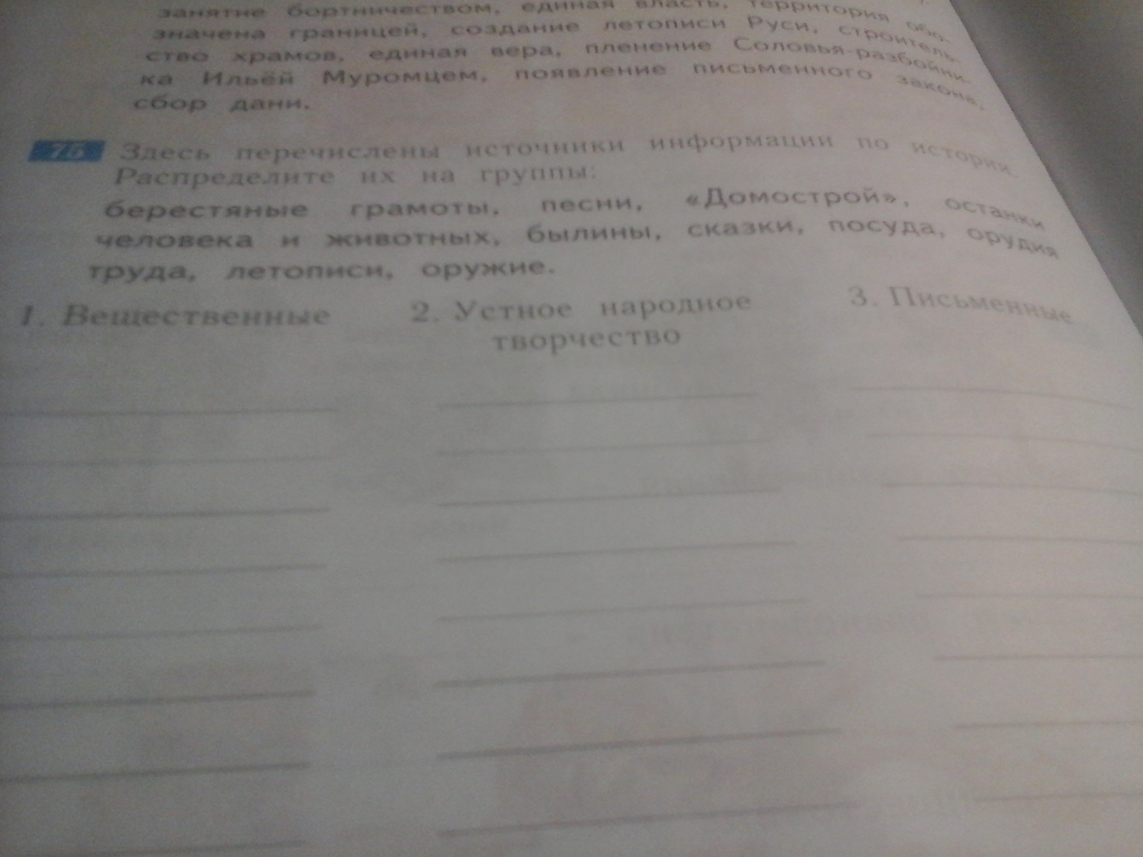 1)вещественные-посуда,орудия труда,оружие,остатки человека и животных,Домострой