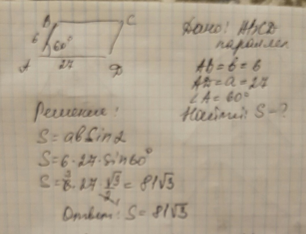Одна из сторон параллелограмма равна 6 ,другая равна 27 ,а один из углов -60 градусов.Найдите площадь параллелограмма