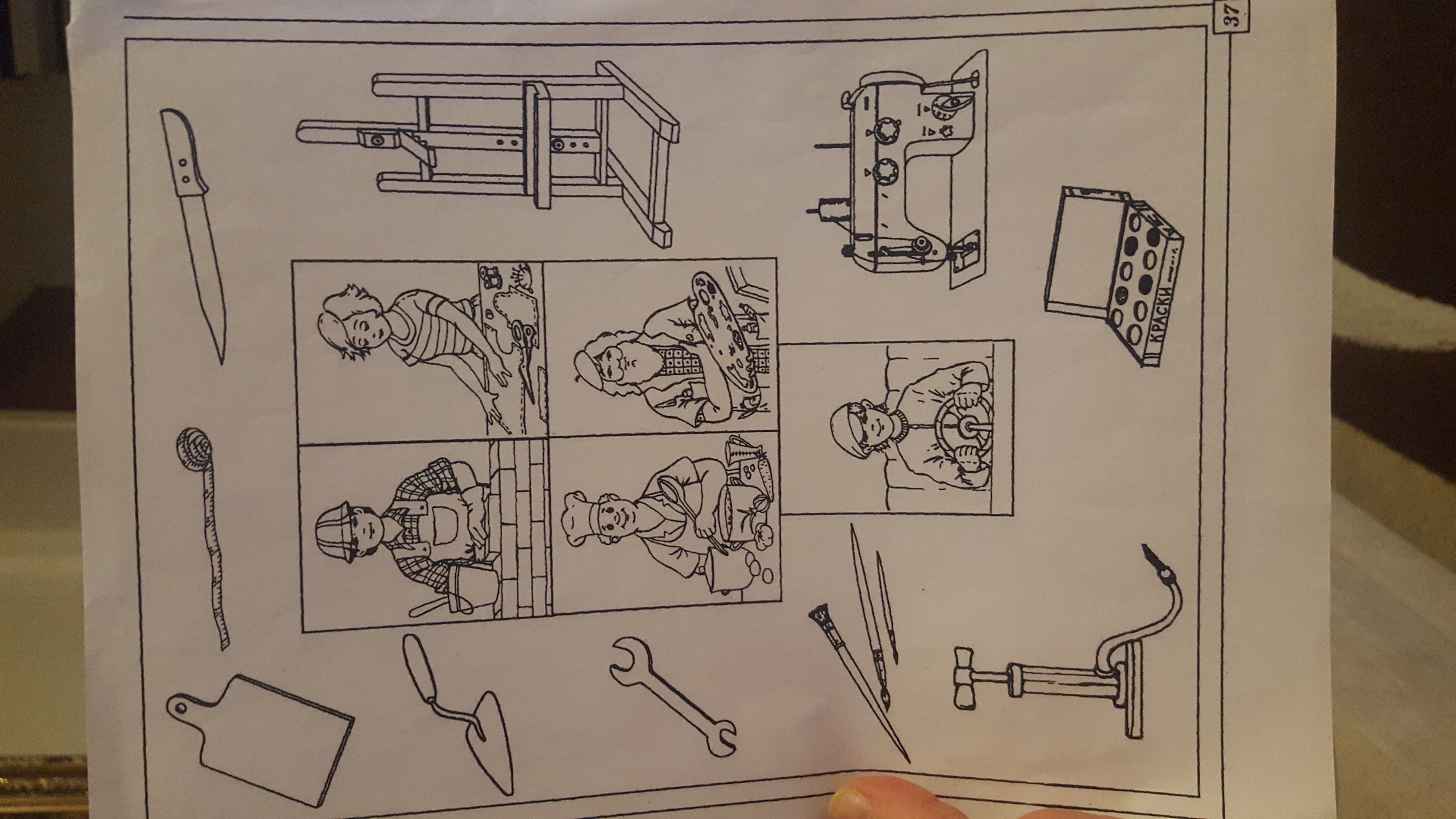 Мольберт, нож, сантиметровая лента, доска, шпатель(но это не точно), гаечный ключ, кисточки, насос, краски, швейная машинка.