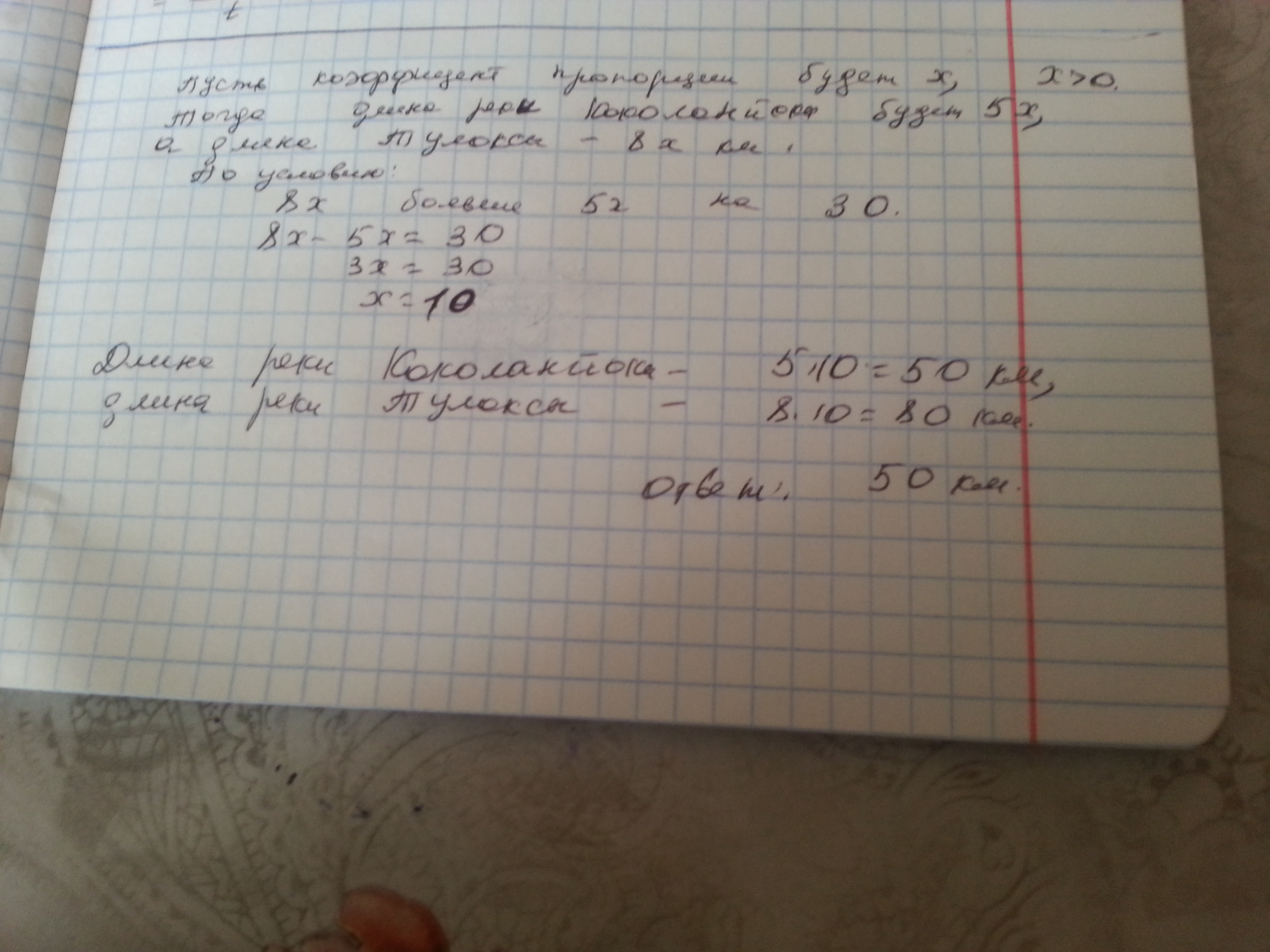 Протяжённости карельских рек Коколанйоки и Тулоксы относятся как 5:8,при этом Тулокса на 30 км длиннее.Найдите протяжённость Кокколанйоки.ответ дайте в км.