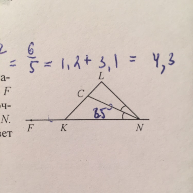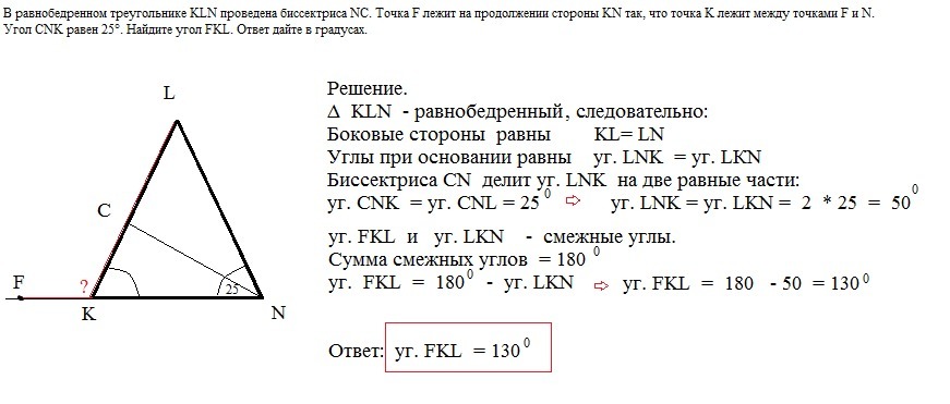 в равнобедренном треугольнике KLN с основанием KN проведена биссектриса NC. Точка F лежит на продолжении стороны KN так, что точка K лежит между точками F и N. Угол CNK равен 25°. Найдите угол FKL. Ответ дайте в градусах.