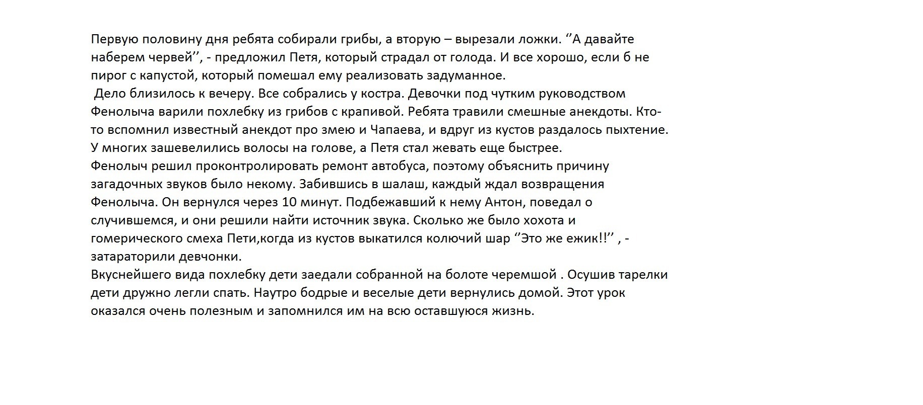 Летом мы с братом ходили по лесу, собирали грибы и ягоды. Зашли в лес густой, потерялись, до вечера бродили по лесу и искали дорогу к лесорубке. Под вечер, когда мы устали и сели отдохнуть, мы услышали шум машины. Мы побежали по звуку и увидели, что это была машина бабушки и дедушки. Дома, мы посмеялись вместе над нашим случаем в лесу.
