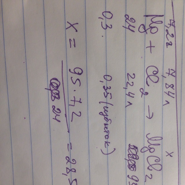 Найдите массу хлорида магния, образующегося при сжигании 7,2 г магния в 7,84 л хлора (н.у.)