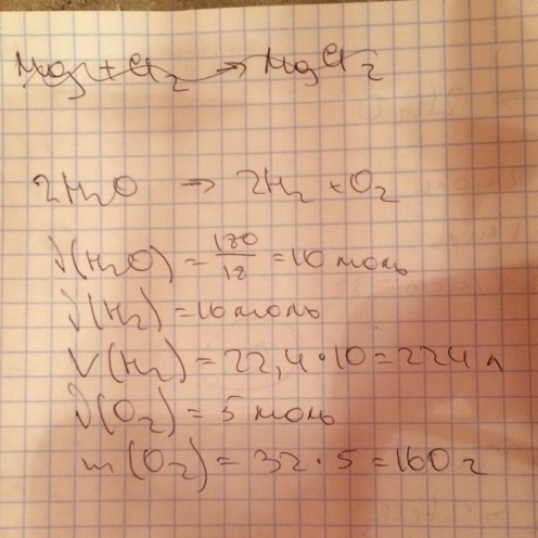 Вычислите массу кислорода и объём водорода,которые образуются при разложении 180г H2O