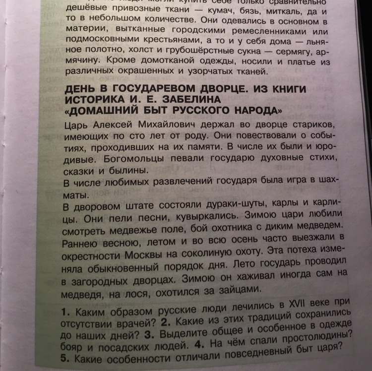 1.каким образом русские люди лечились в 17 веке при отсутствии врачей?2.какие из этих традиций сохранились до наших дней?3.Выделите общее и особенное В одежде бояр и посадских людей.4.На чем спали простолюдины?5.Какие особенности отличали повседневный быт царя?