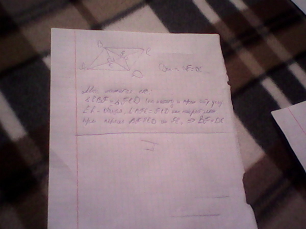 1) так как это парал., то ав=сд. и вс праллельно ад,значит накрест лежщие угла вас=асд, значит прямоугольные треугольники аве=сfд по гипотенузе и острому углу, следовательно и ве=дf