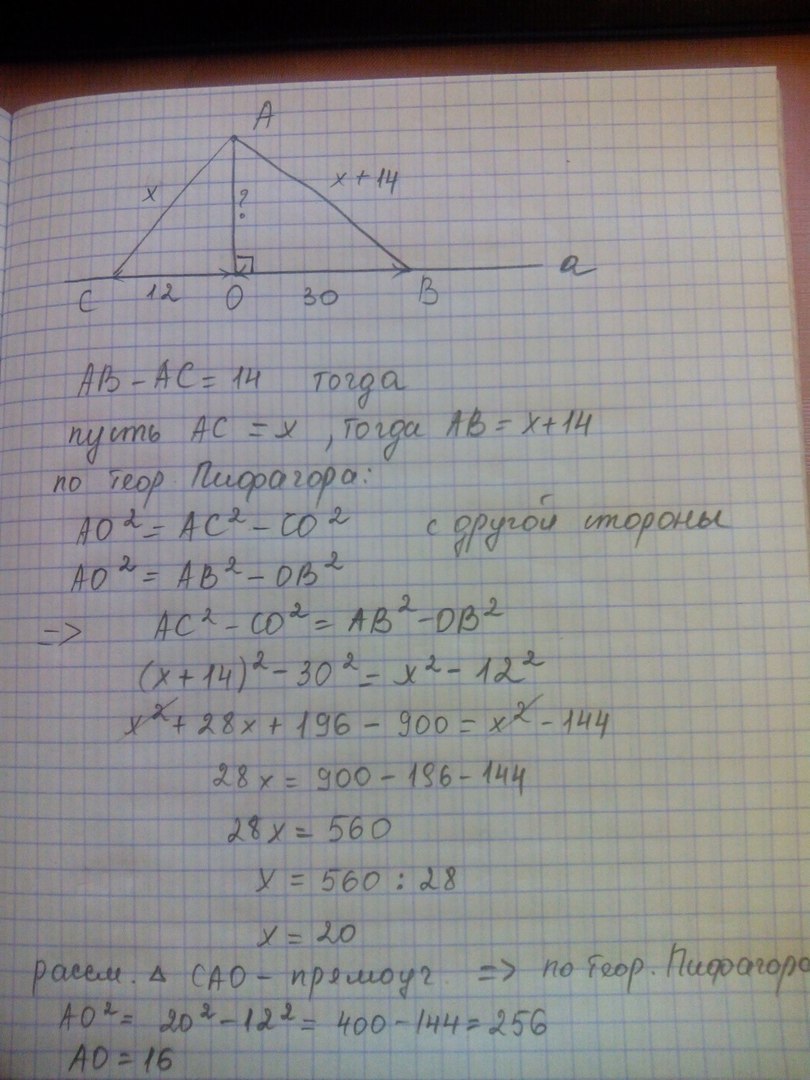 Помогите, даю 50 баллов!! Із точки до прямої проведено дві похилі, проекції яких на пряму дорівнюють 12 см і 30 см. Знайдіть відстань від точки до прямої, якщо різниця довжин похилих дорівнює 14 см.