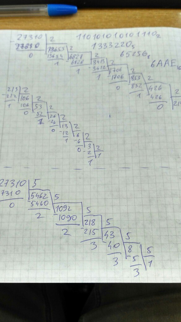 1) 27310 (10) = 110101010101110 (2) = 1333220 (5) = 65256 (8) = 6AAE (16)