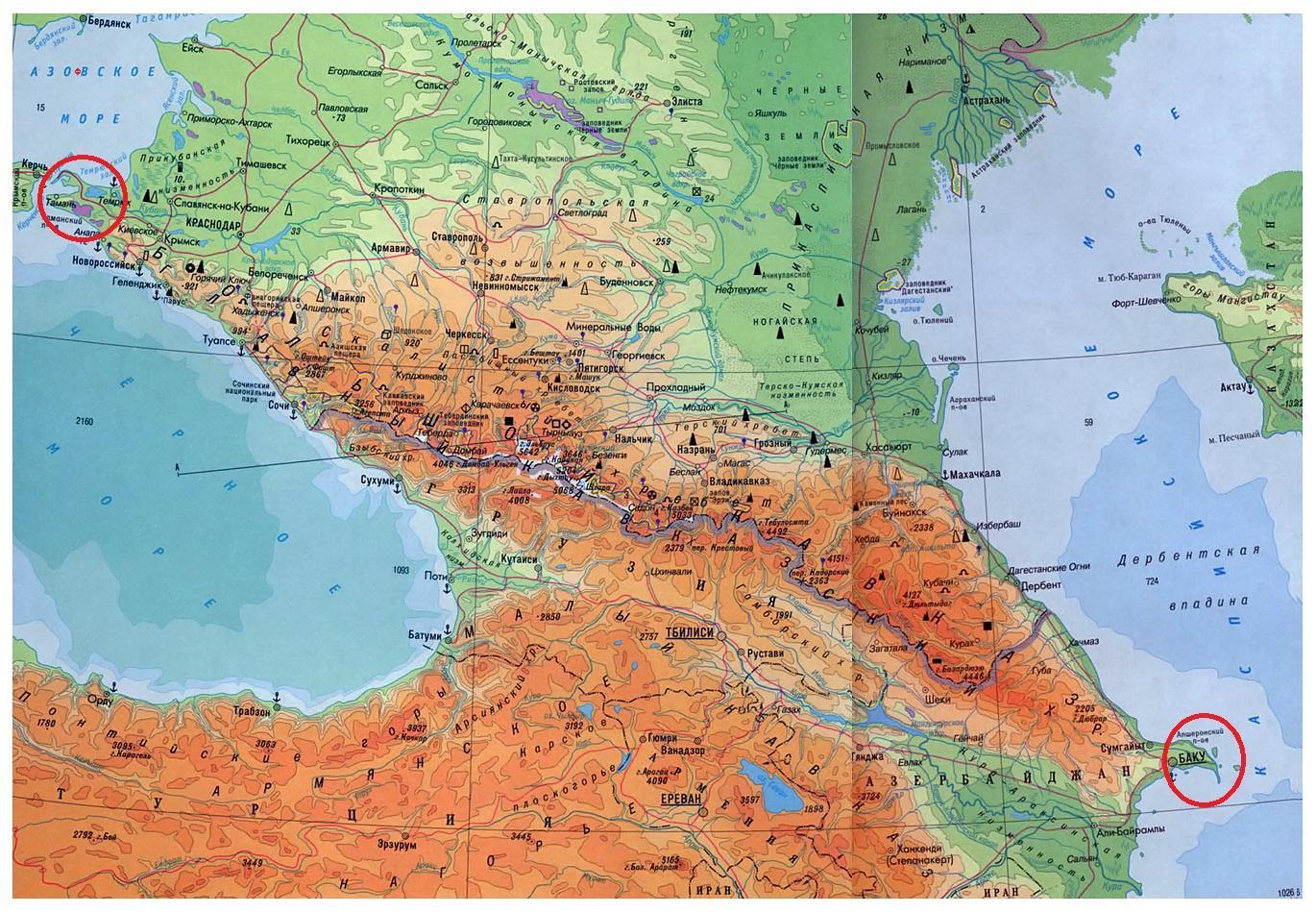 Кавказские горы расположены между Таманским полуостровом (Азовское и Чёрное моря) на северо-западе и Апшеронским на юго-востоке (Каспийское море).