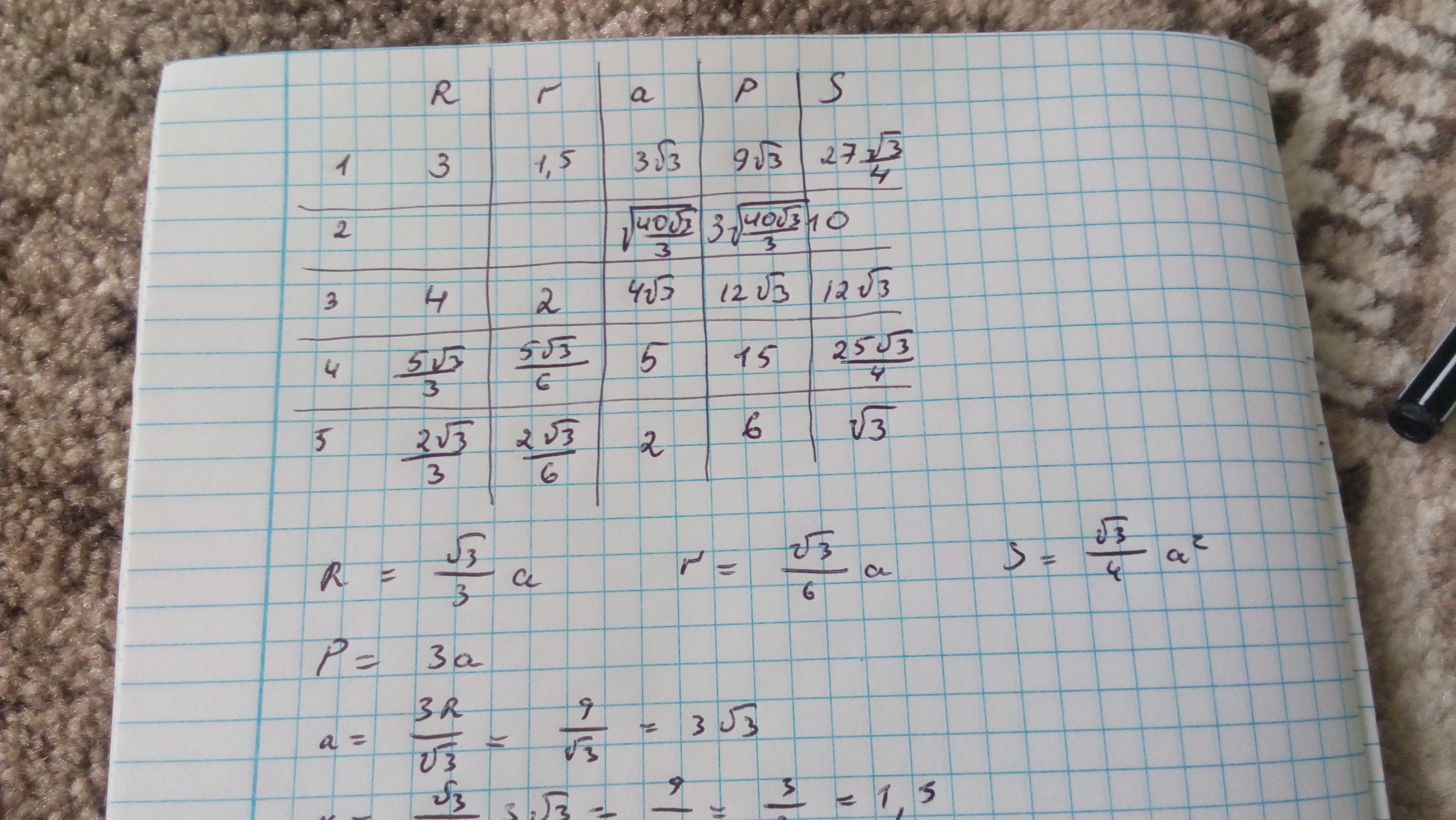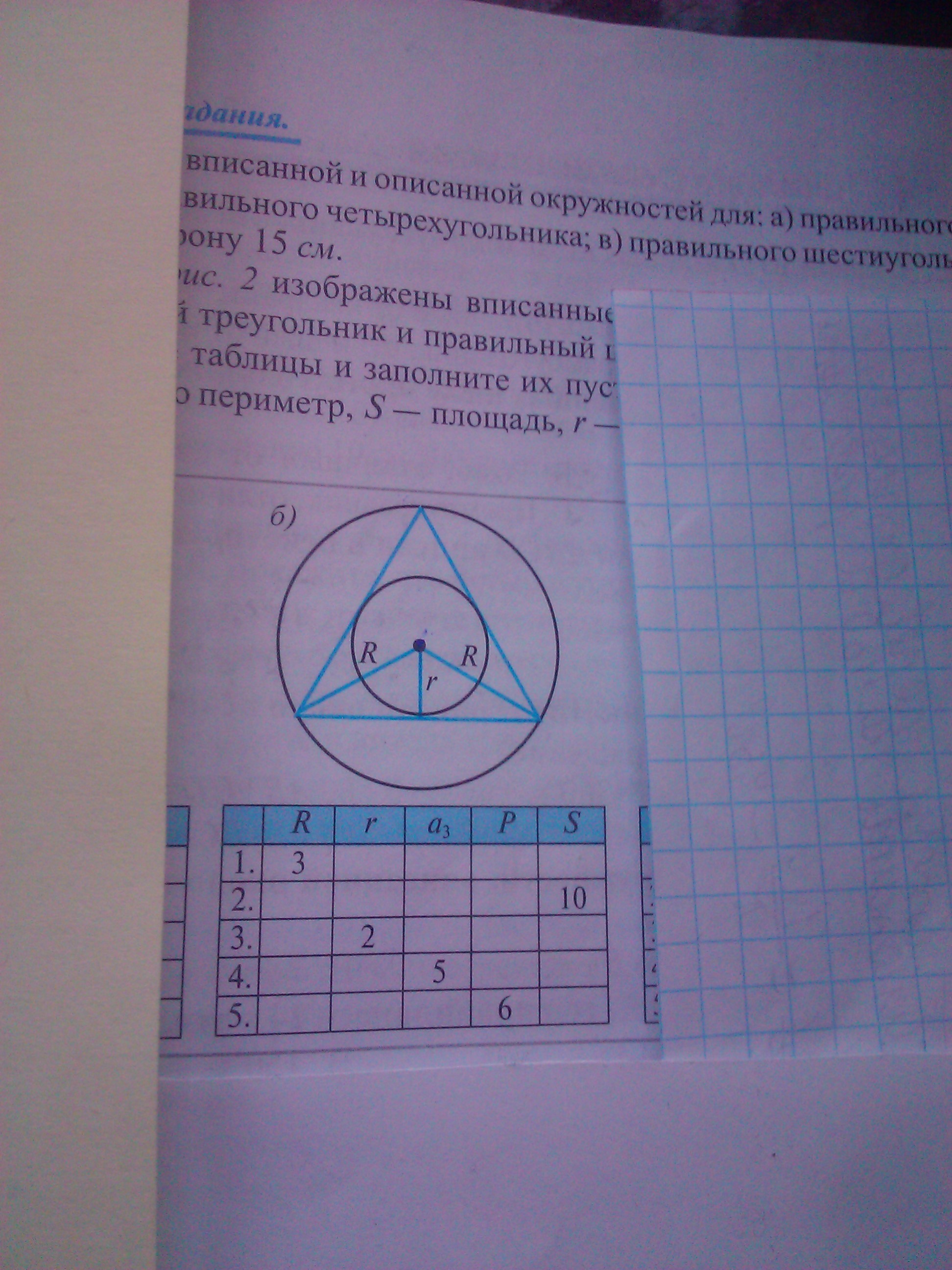 На фото рисунок 2. б) изображён вписанный в окружность радиуса R правильный треугольник , надо заполнить таблицу.