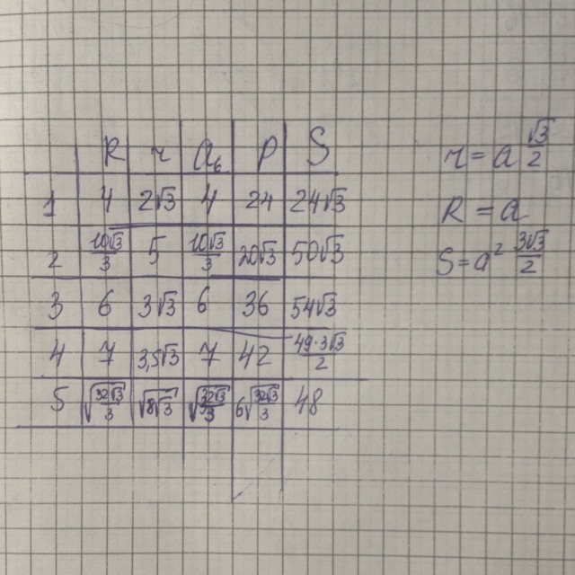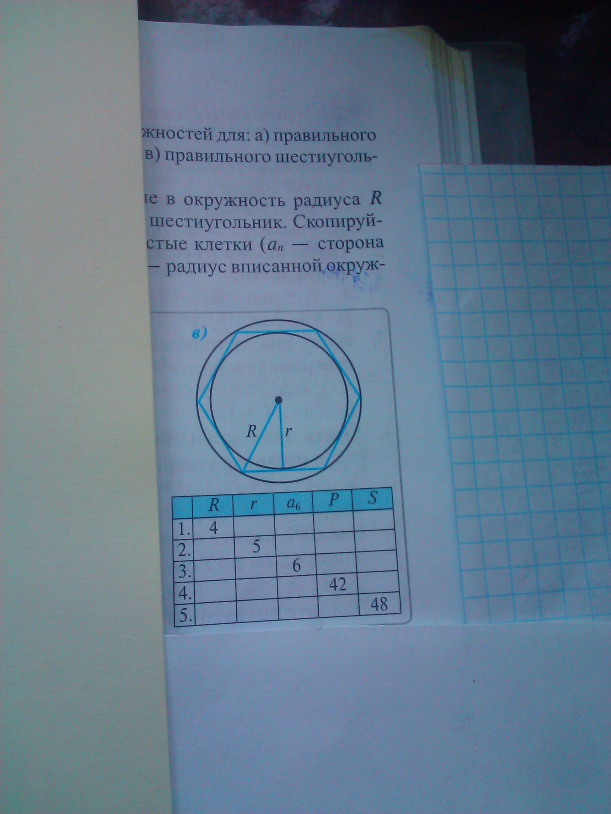 На фото рисунок 2. в) изображён вписанный в окружность радиуса R правильный шестиугольник , надо заполнить таблицу.