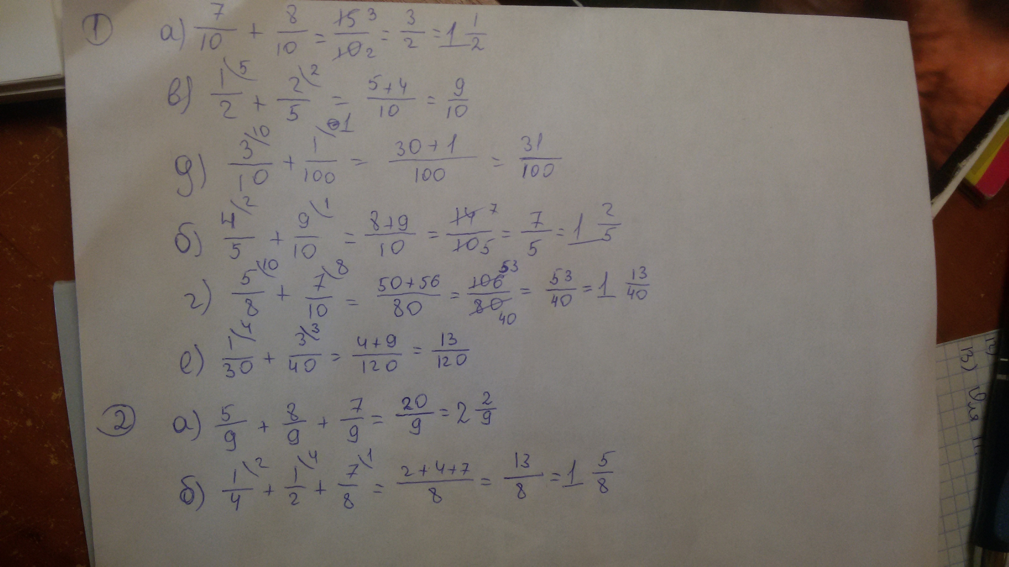 1.а)7/10+8/10 в)1/2+2/5 д)3/10+1/100