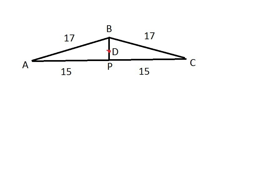 В треугольнике ABC, AB=BC=17cm, AC=30cm, BD перпендикуляр к плоскости и равен корень 17 , найти расстояние от точки D до прямой AC. (с рисунком пожалуйста)