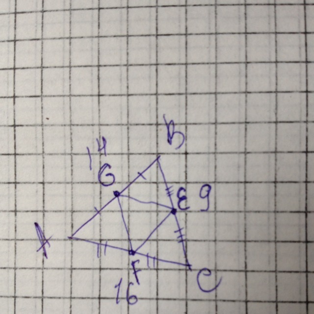 в треугольнике abc стороны ab bc и ca равны соответственно 14 см, 9сс и 16см. точки e, f и g обозначают середины сторон этого треугольника. на каких сторонах лежат эти точки, если известно, что ge=8см fe=7см fg=4,5см?