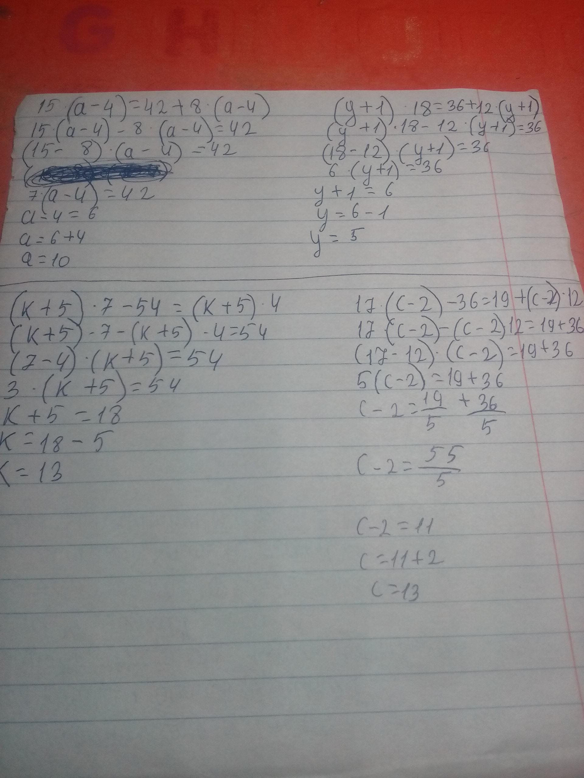 реши уравнение любым способом. 15*(a-4)=42+8*(a-4) (y+1)*18=36+12*(y+1) (k+5)*7-54=(k+5)*4 17*(c-2)-36=19+(c-2)*12