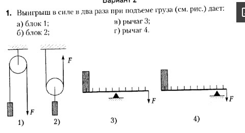 выигрыш в силе в два раза при подъеме груза дает: а) блок 1; б) блок 2; в) рычаг 3; г) рычаг 4