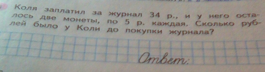 Коля заплатил за журнал 34 руб. и у него осталось 2 монеты по 5 руб. каждая сколько рублей было у Коли до покупки журнала. (печатная тетрадь)