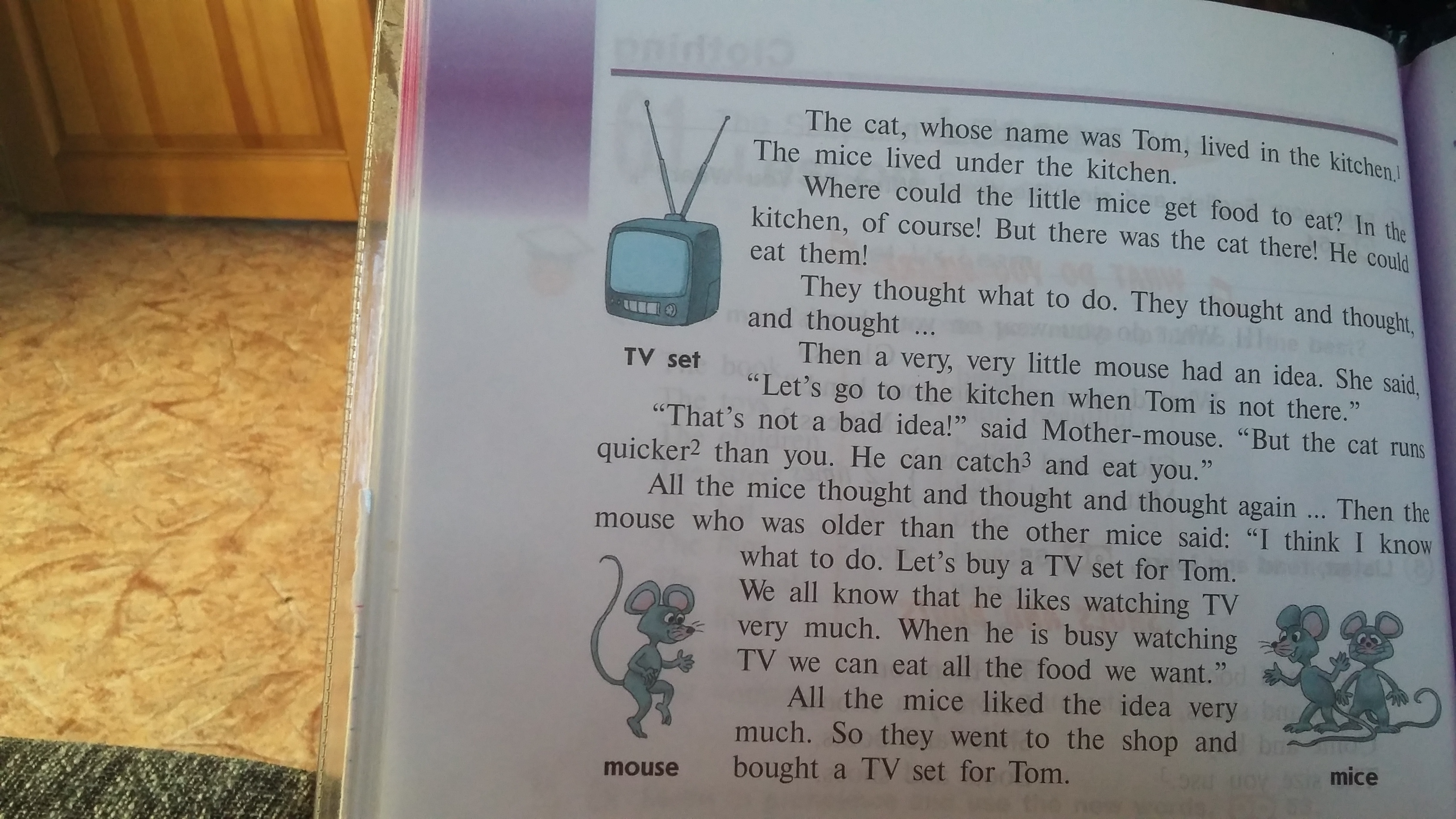 И снова мышата призадумались. Тогда старейшина мышей заявил: " Есть у меня одна мыслишка. А почём бы нам не купить ему телевизор! Прекрасно знаете, котофей души не чает в нём. Том, когда будет увлеченно смотреть телевизор, мы-то и наполним свои животы до отвала!