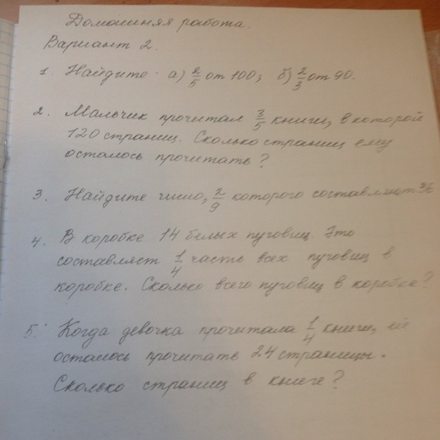 1. 2/5 от 100=100·2÷5=40;2/3 от 90=90·2÷3=60 2.1)120·3÷5=72 3. 36=8 4.10 пуговец 5.1)24÷4=6