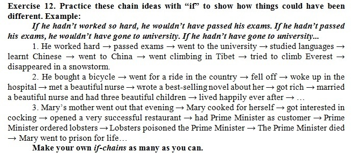 If he hadn't bought a bicycle, he wouldn't went for a ride in the country. If he hadn't fell of, he wouldn't woke up in the hospital. If he hadn't met a beautiful nurse, he wouldn't wrote a best-selling novel about her. If he hadn't got rich, he wouln't married a beautiful nurse and had three beautiful children. If he hadn't lived happily ever after, he wouldn't began such a well-known.