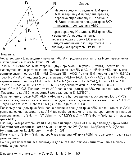 Через середину К медианы ВМ треугольника АВС и вершину А проведена прямая, пересекающая сторону ВС в точке Р. Найдите отношение площади треугольника ВКР и площади треугольника АМК.