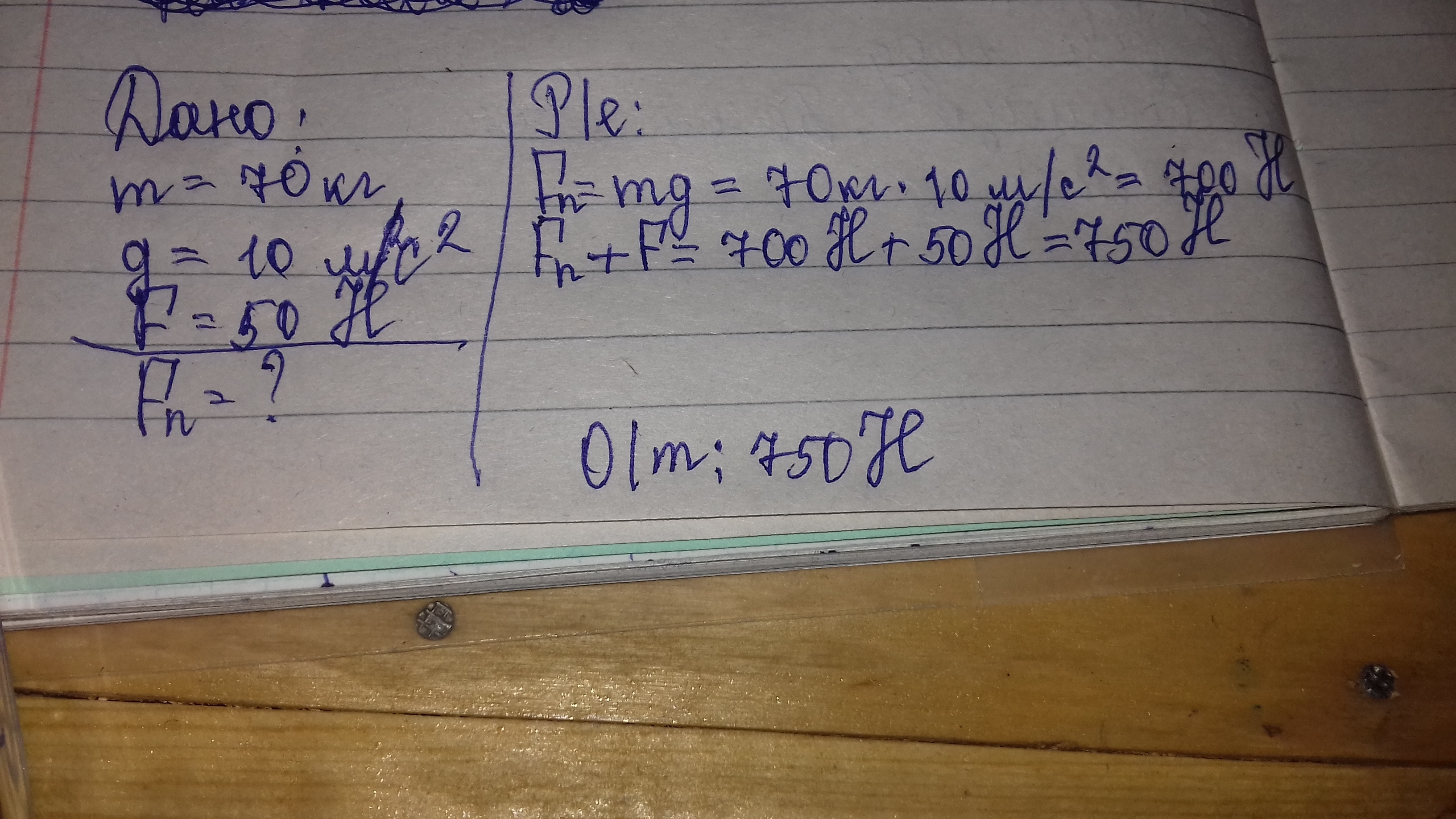 F-mg,значит 70*10равно700 и +50Нравно 750Н