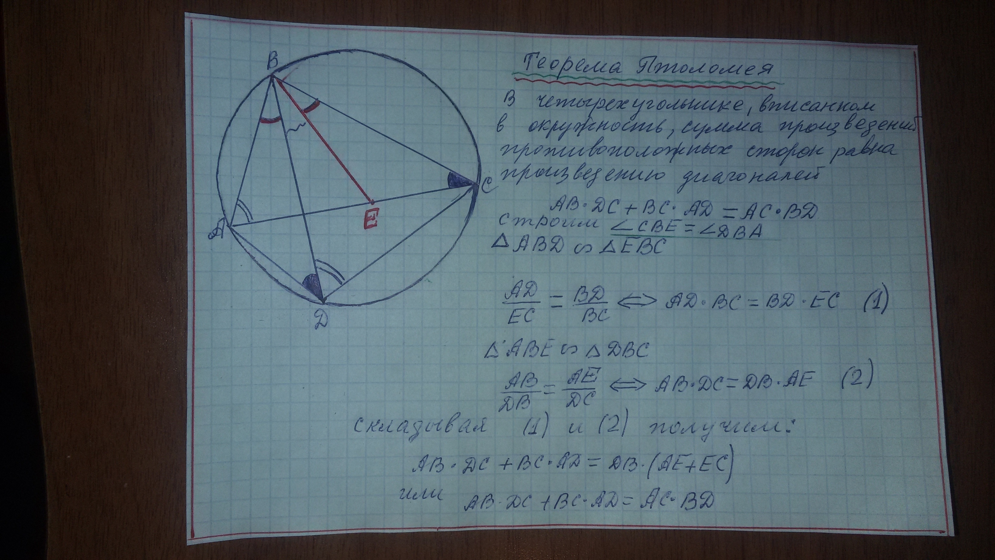 Теорема Птолемея с доказательством. Приветствуются альтернативные (нестандартные) доказательства. Четкие и разборчивые рисунки обязательно.