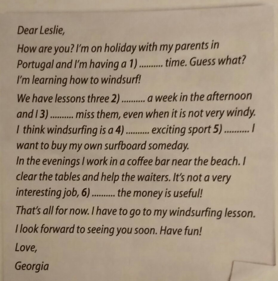 У нас уроки три раза 2... неделю после обеда и я не 3 .... их , даже когда очень ветрено. я думаю, серфинг это 4 ... потрясающий спорт...5 я хочу купить когда-нибудь собственную доску для серфинга.