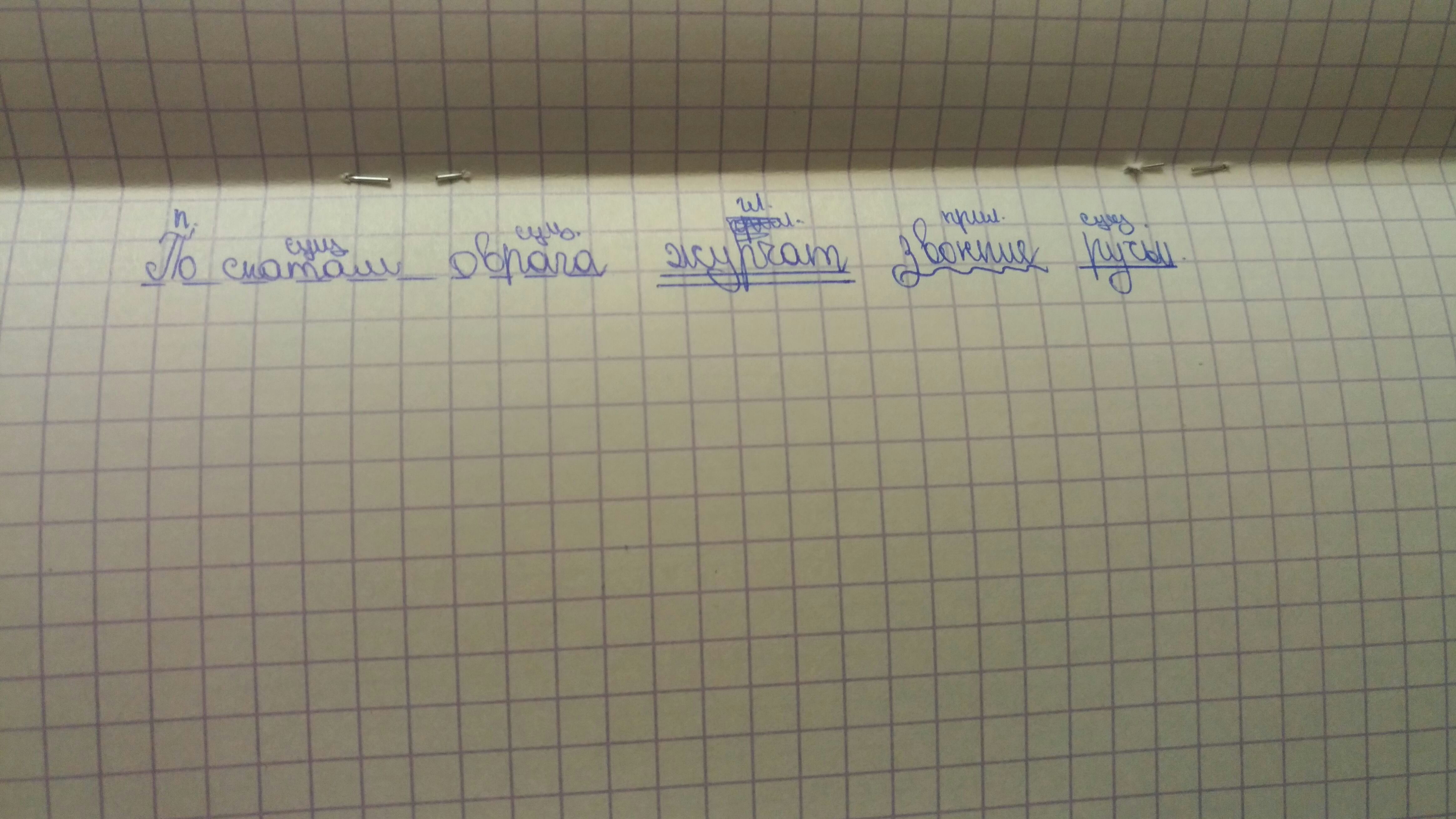 По ( предлог - - -) скатам ( сущ. - - -) оврага ( сущ - - -) журчат ( глагол 2 черты) звонкие ( прилаг. волнистой чертой) ручьи ( сущ. 1 чертой)