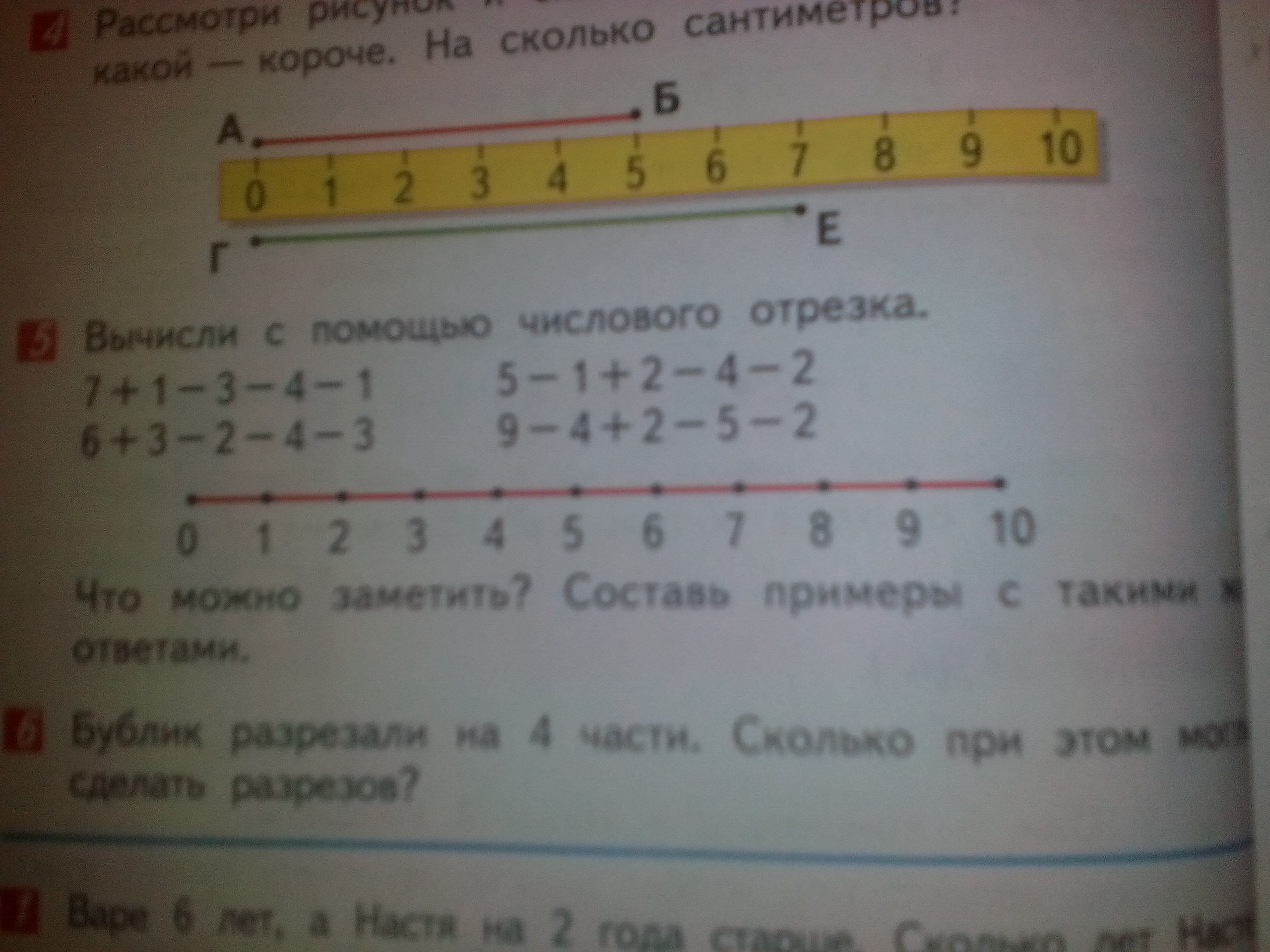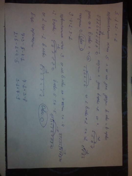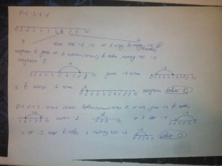 Первое число мы берем за начало. То есть в первом примере. Сначала берем точку 7 и от нее ведем расчет. А точнее +1, значит в прав уходим на +1 точку. Получаем 8. Теперь от 8 уходим на 3 точки влево. потому что -3. Получили 5. А теперь от 5 на 4 точки Влево потому что -4. Получили 1. Теперь от 1 влево на 1 клетку . получили 0.