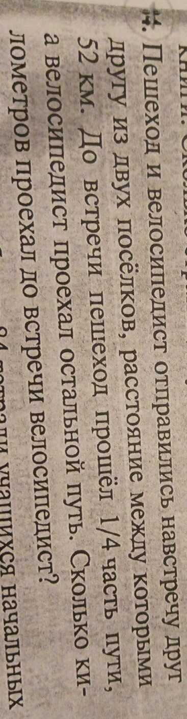 т.к пешеход прошёл 1/4 часть всего пути , следовательно он прошёл (52/4=13) , а велосипедист остальной путь , т.е 52-13=39